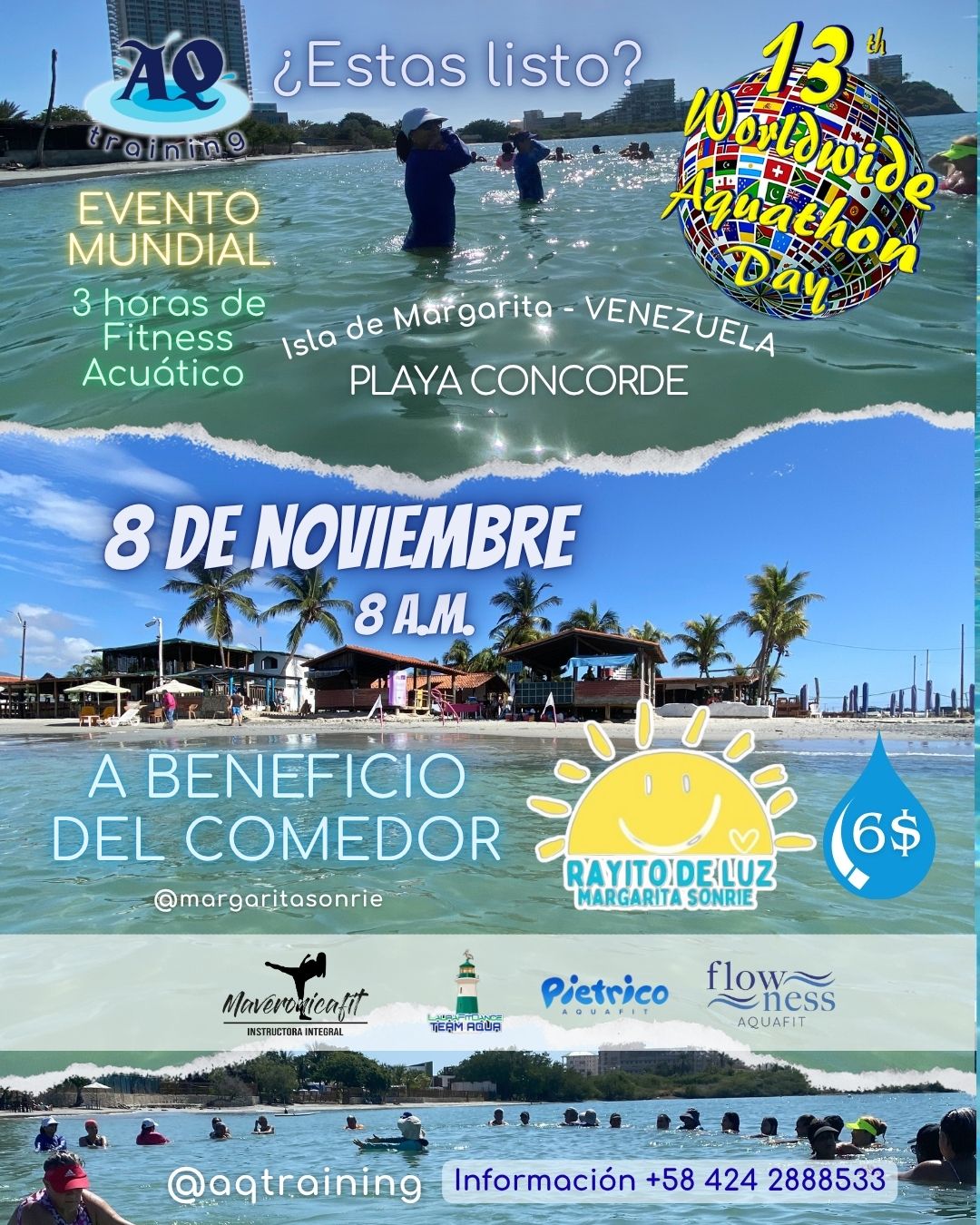 We will be present at the Worldwide Aquathon Day from Venezuela, on Saturday, November 8th, starting at 8 am at Playa Concorde, with 6 instructors to benefit the "Rayito de Luz" children's soup kitchen.